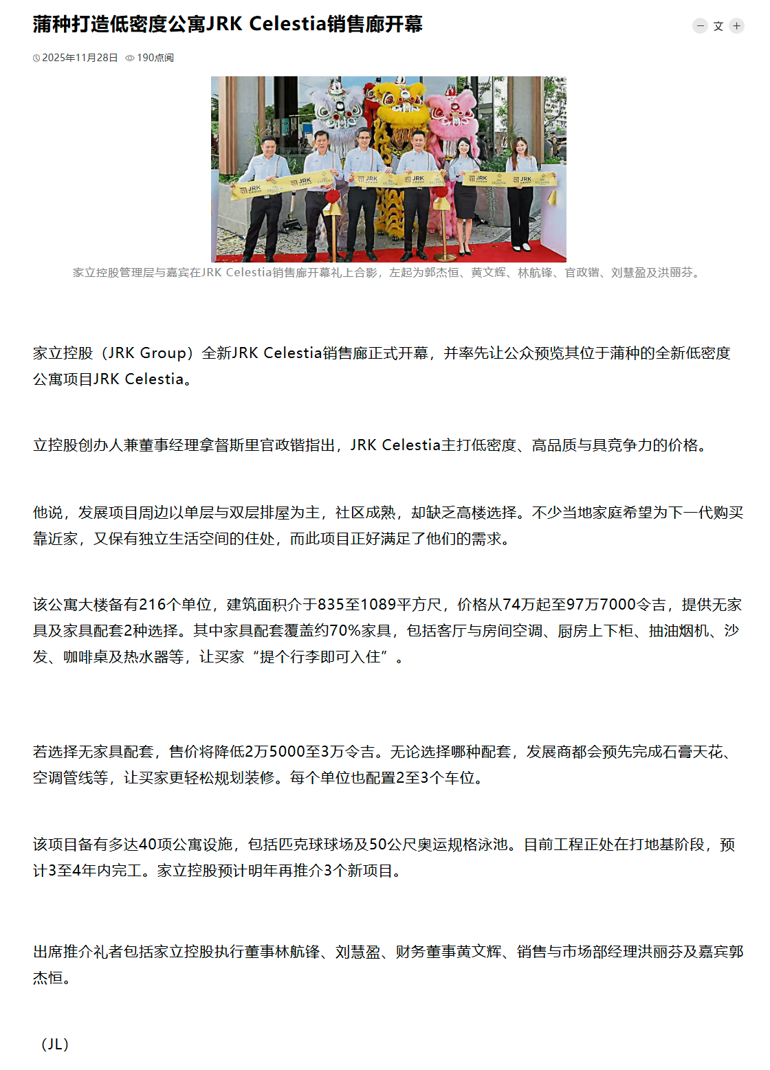 推介蒲种低密度公寓 JRK Celestia展廊开幕